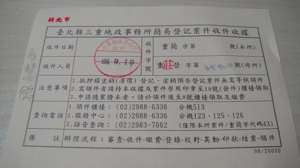 最後由老婆大人至三重地政事務所辦理塗銷,獲得收據一張。