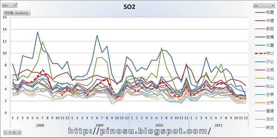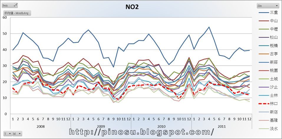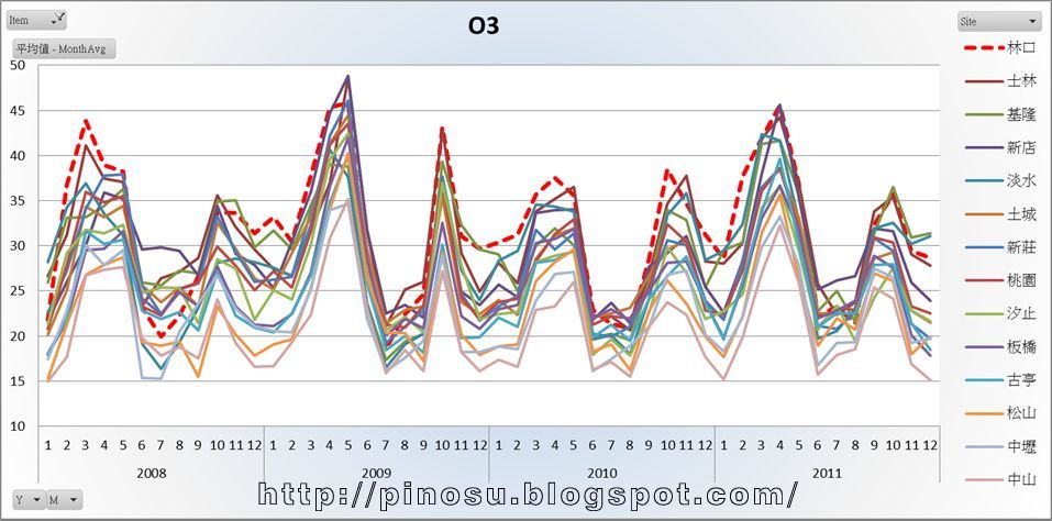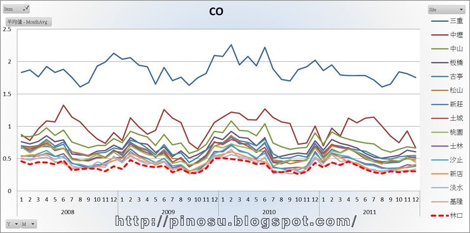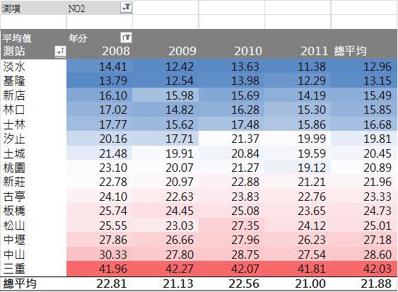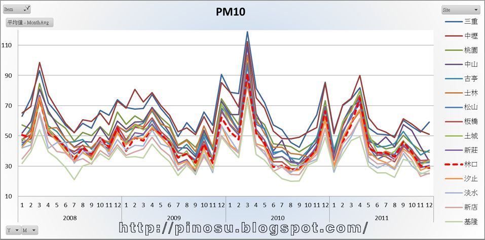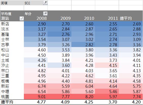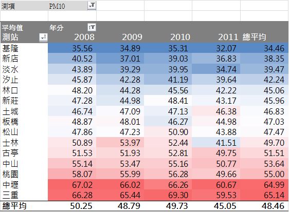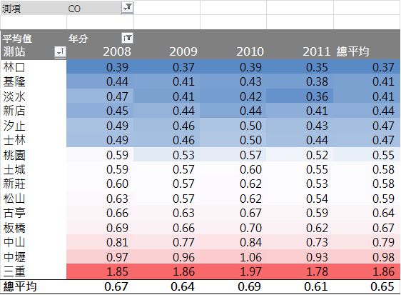 周末在家花了些時間整理了近四年(2008~2011)的環保署空氣品質監測數據,