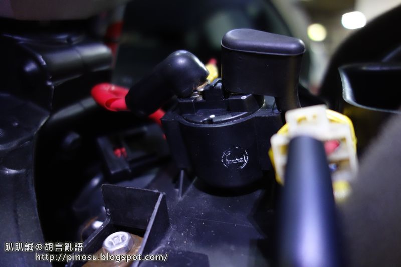 ▲ 將油箱掀起後,看到電瓶上的啟動繼電器了,兩支螺絲上一頭接著紅色電源線連接電瓶,一頭則是接往車子裡去;並且有個白色快接頭插著,上頭有三條線!