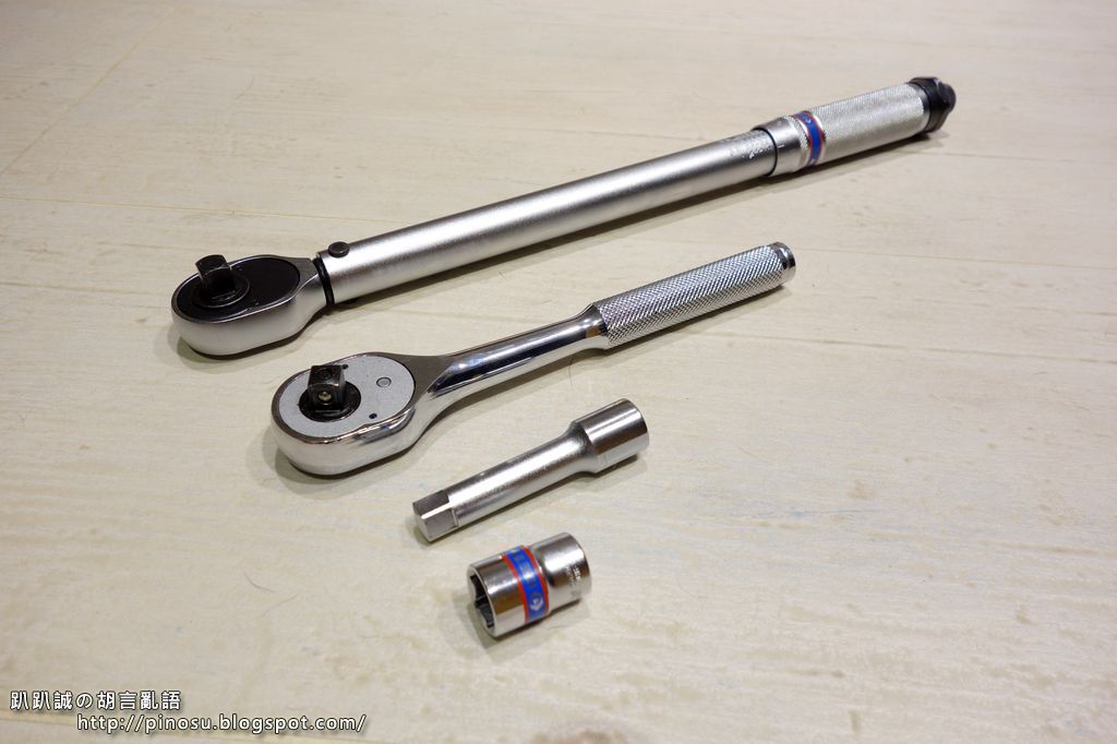 ▲ 準備工具 : 由上至下分別為,扭力扳手(20~110Nm)、棘輪扳手、接桿(10cm)、14mm六角套筒
