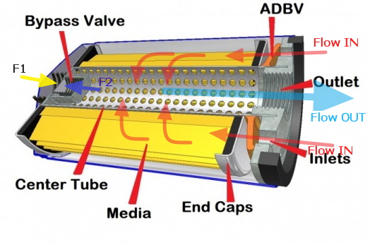 為避免濾紙阻塞時機油無法順利流過,在油芯內會設置旁通閥避免引擎無法獲得潤滑而受損;一般而言旁通閥開啟的時機為濾紙內外壓力差大於15psi (依濾紙材質及內部設計而有所不同),即圖中 F1-F2 > 15Psi時,閥門會受F1壓力推開使機油流過。