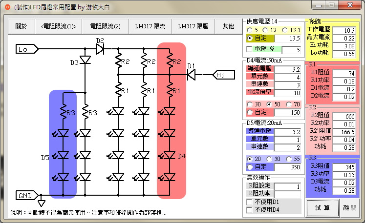 ▲ 使用游牧大白提供的軟體計算所需的電阻歐姆數。