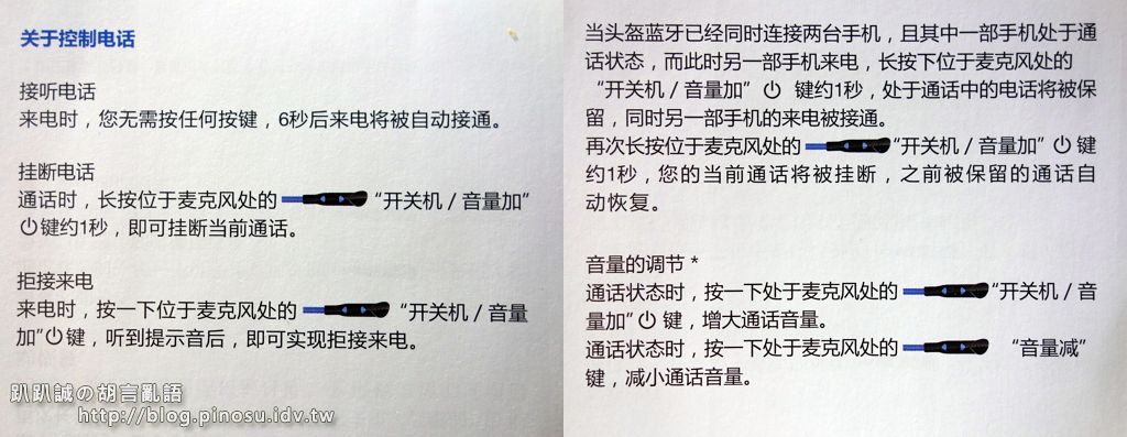 ▲ 耳麥上頭的兩個按鍵就只有說明書所提的這簡單的功能,沒有提到是否能多個耳麥裝置直接對講通話。