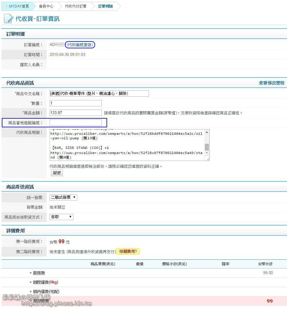 而下方的追蹤編號欄位先空著,等到「破克樂柏」將物品寄出的時候,會發 Email 通知,再將編號填寫過來 Myday 這邊即可,這樣 Myday 就知道貨要來了,可以幫忙追蹤。