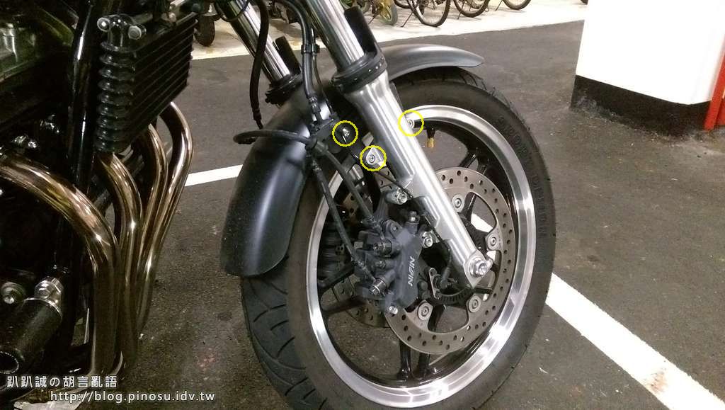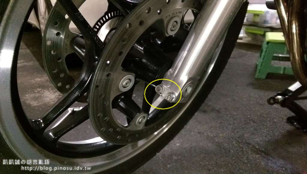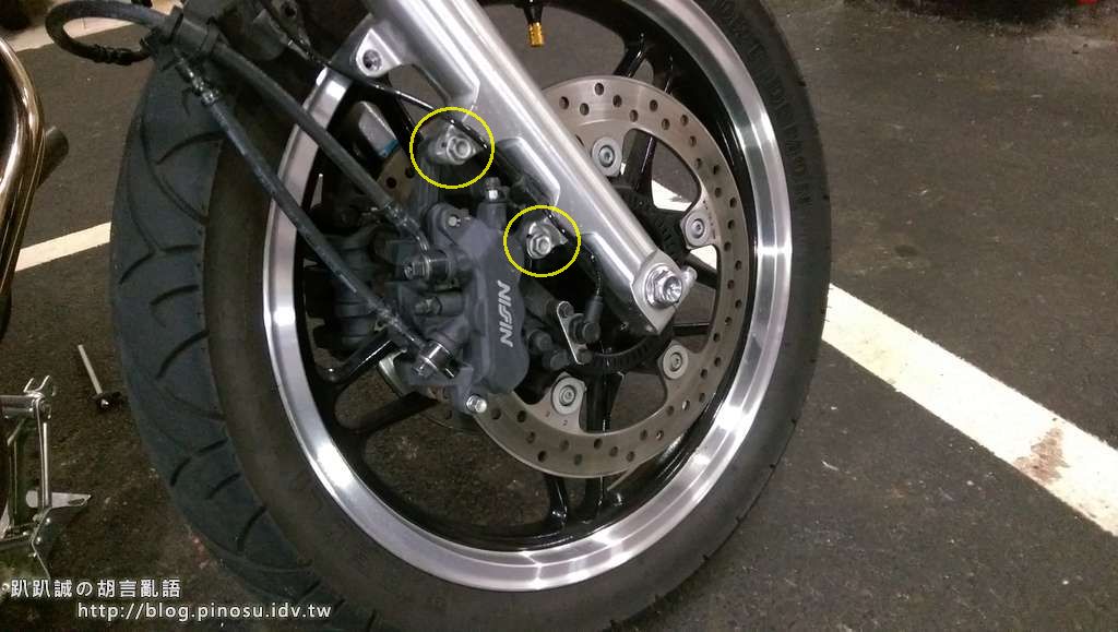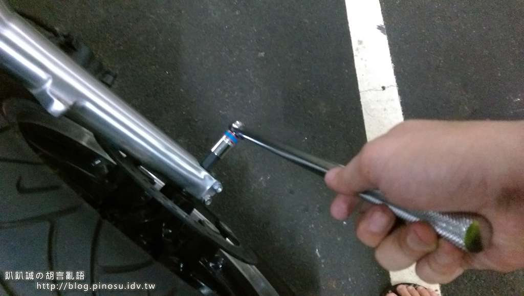 前輪裝上後將右側的兩顆輪軸固定螺絲鎖緊,再把卡鉗及土除裝回去,放下車身後試著壓壓看前叉是否正常,再將左側兩顆輪軸固定螺絲也鎖緊就完成安裝了。