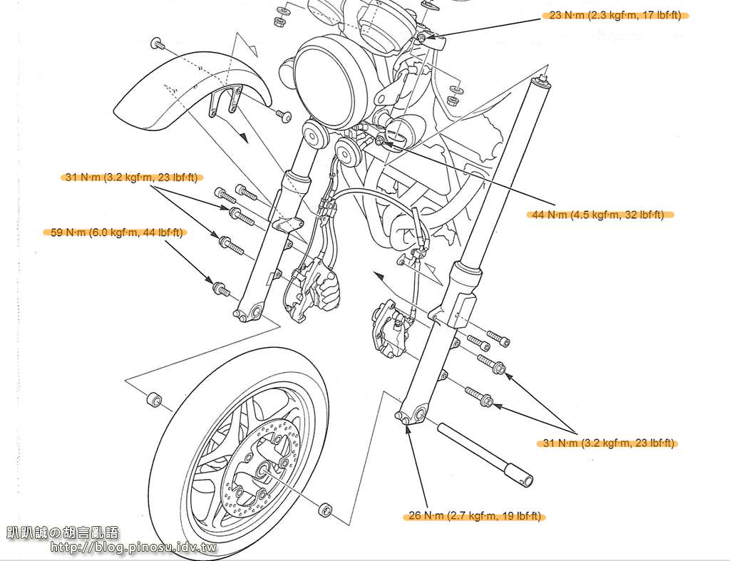 ▲ 附上原廠維修手冊截圖 (點擊圖片可放大瀏覽),各個拆裝的螺絲請參考扭力值鎖回以確保行車安全。