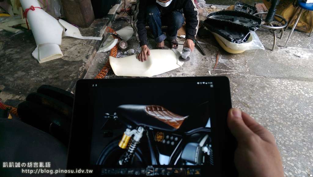 ▲ 於是帶著原廠坐墊又來到台北羅斯福路上的新合春坐墊行,拿著平板開著照片給老闆看「老闆,我要這樣子,麻煩你。」