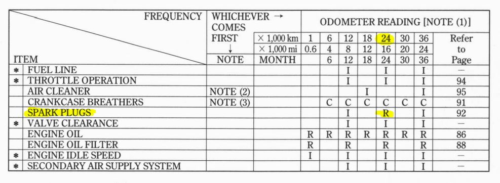 ▲ 車主手冊建議的保養時程表。 火星塞建議於 24000 KM 時進行更換。