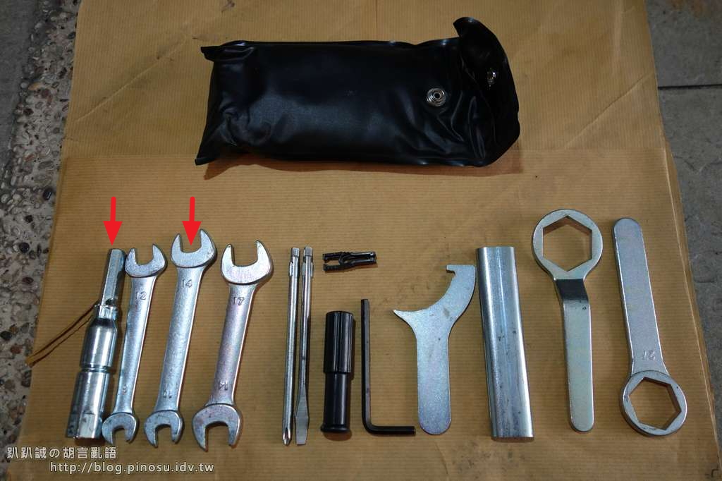 ▲ 買車時隨車附的工具包,這時候終於要派上用場了,更換火星塞需要用的工具如圖中箭頭所指,其中有專用的火星塞拆卸套筒工作。