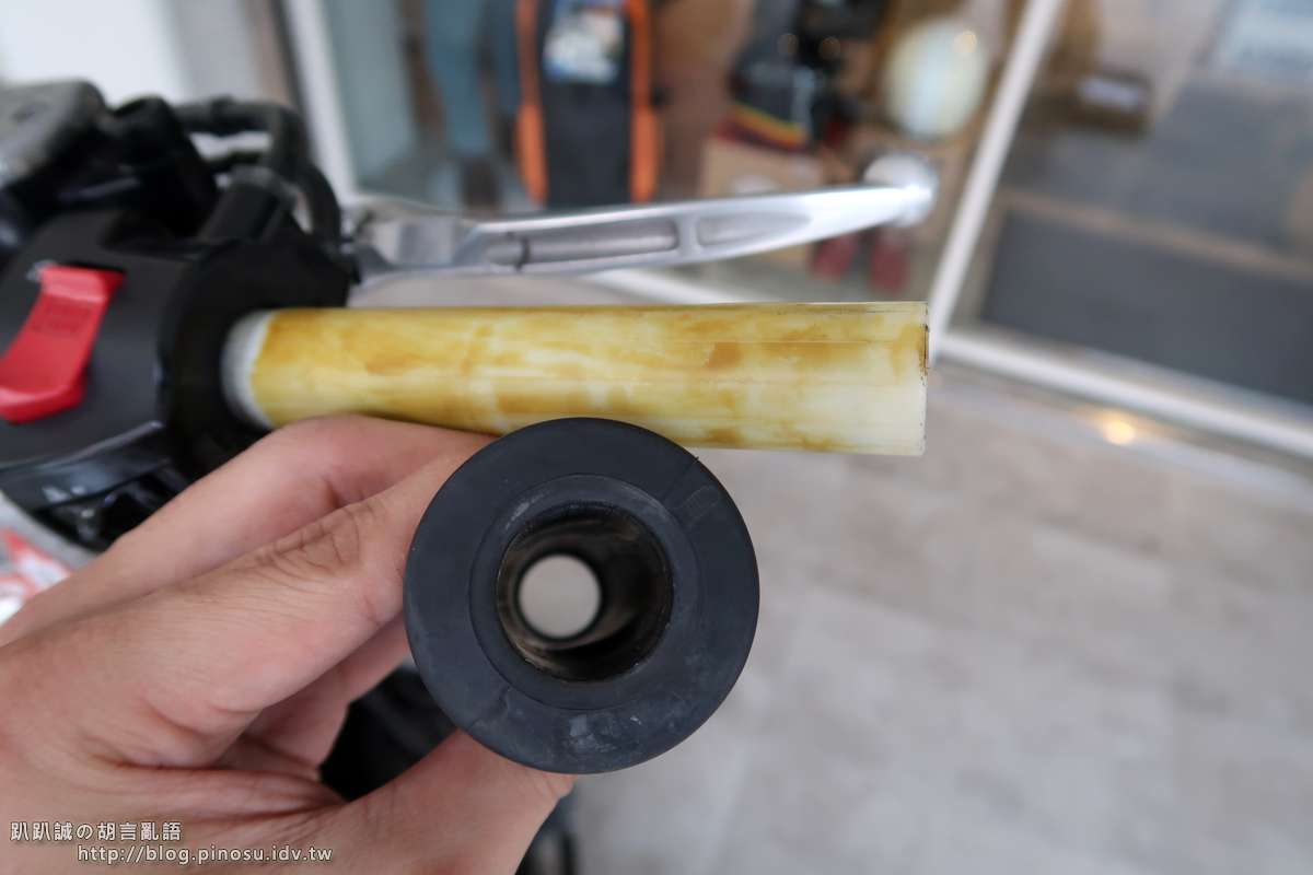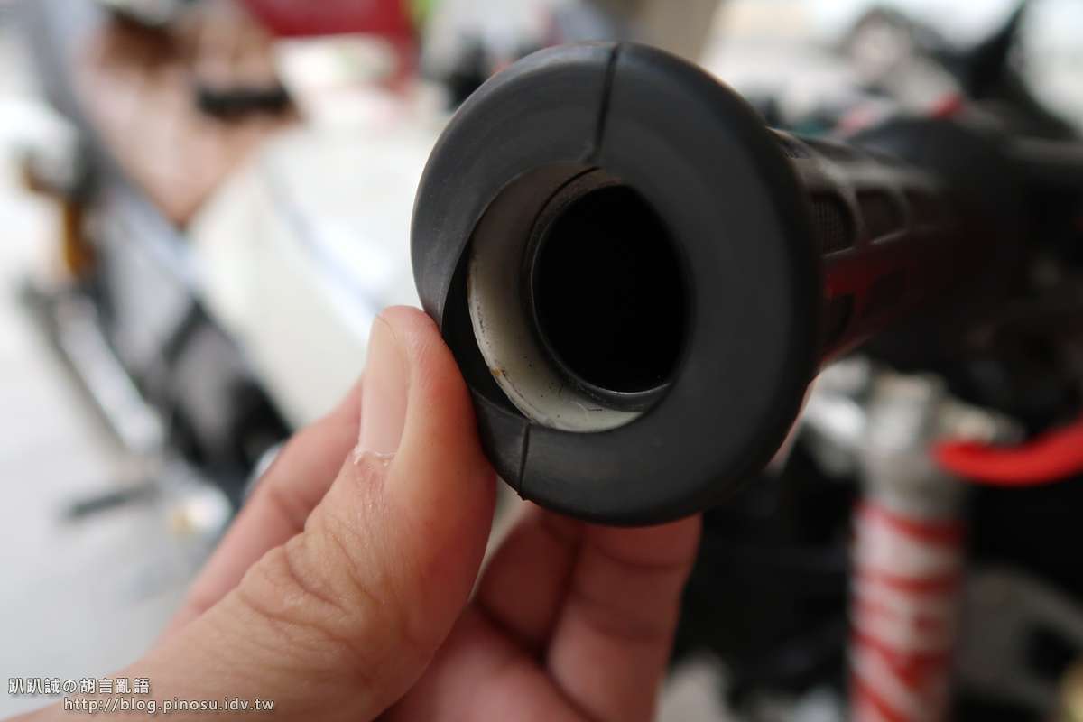 ▲ 使用高壓氣槍,對準握把套與油門座筒身之間吹氣,吹氣的同時將握把套向外拉出,很輕鬆便可以將握把套取下。若沒有氣槍的話,嗯…. 可能會很難搞,除了割開它之外,還是會建議到自助洗車投個10元用一下。
